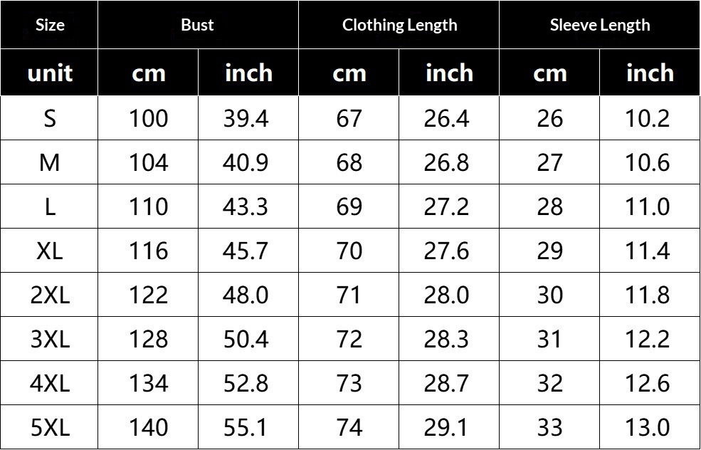 Sizes: S, M, L, XL, XXL, 3XL, 4XL, 5XL